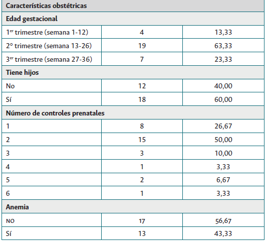 Entre los principales resultados, destaca que entre las participantes la media aritmética de la edad fue de 27,33 años, 56,67 % convivía con su pareja, 60 % contaba con educación secundaria y 66,67 % no tenía una ocupación remunerada. Respecto a las características obstétricas, el 63,33 % se encontraba en el segundo trimestre, 50 % había asistido solo a dos controles y 60 % tenía hijos. Finalmente, el 43,33 % presentó anemia. El detalle de los resultados se aprecia en la Tabla 1.