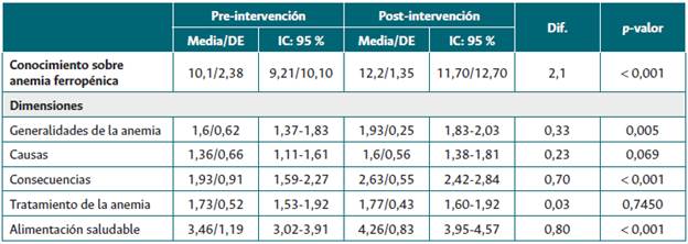 En la Tabla 2 se observa que la media de los conocimientos de la anemia ferropénica en la pre-intervención fue 10,1, mientras que después de la intervención la media aumentó 2,1 puntos y se mostró significancia (p < 0,001). De igual forma, después de la IE aumentaron los puntajes de las dimensiones generalidades de la anemia (p = 0,005), consecuencias de la anemia (p < 0,001) y alimentación saludable (p < 0,001).