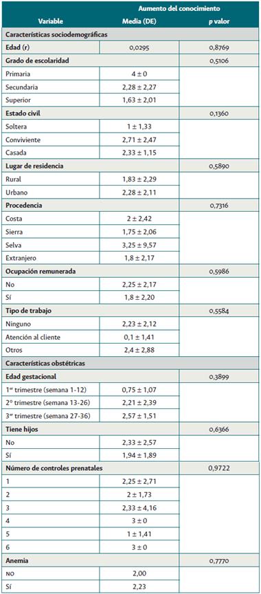 En la Tabla 3 se realizó el cruce entre el aumento del conocimiento sobre la anemia ferropénica con las características sociodemográficas y obstétricas. Este aumento fue la diferencia entre post y pre-intervención de la variable. Sin embargo, no se evidenció ninguna relación significativa con la misma (p > 0,05).