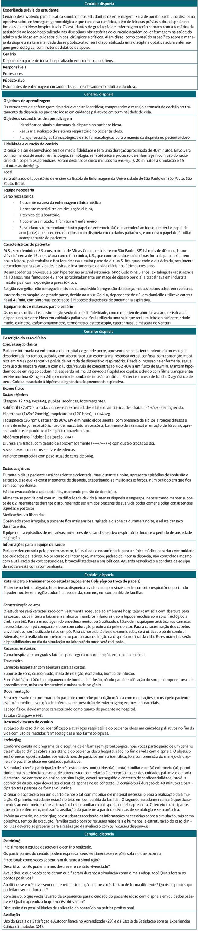 No contexto das possíveis metodologias, encontra-se a estratégia da simulação, a qual propicia uma interação entre simuladores e atores, em um ambiente controlado, o que possibilita a realização de cuidados que fogem de habilidades psicomotoras, contexto em que o professor tem um papel de condutor, e não de um fornecedor ativo de toda a informação 8. Por sua vez, o estudante, ao ser sujeito ativo da aprendizagem, com a simulação, melhora o cumprimento de metas, o trabalho em equipe, o processo de tomada de decisão e a liderança, além de desenvolver o pensamento crítico com respostas rápidas diante dos desafios de assistir um paciente em cuidados paliativos 9 que apresenta diferentes sintomas, como a dispneia.