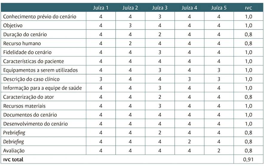 Quanto à validação do cenário, identificou-se que cada item avaliado pelo ivC esteve entre 0,8 e 1,0, e o valor total do cenário foi de 0,91 (Tabela 1).