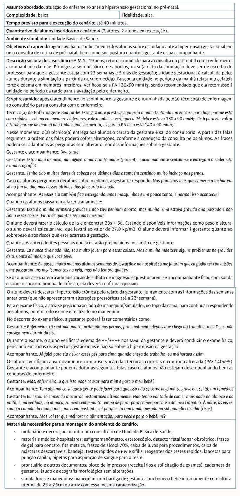 O cenário desenvolvido descreve uma situação de uma gestante com 23 semanas e 5 dias de gestação, que comparece à consulta de pré-natal com enfermeiro, referindo cefaleia e edema. No atendimento, apresentou pressão arterial limítrofe, sendo orientada a retornar horas depois para a reavaliação pelo enfermeiro. A proposta do cenário é avaliar o conhecimento dos estudantes acerca dos critérios para o diagnóstico de hipertensão gestacional e o encaminhamento da gestante ao serviço de referência, além dos conhecimentos relacionados às orientações que devem ser fornecidas à gestante com esse agravo. O Quadro 1 resume as principais informações acerca do cenário.
