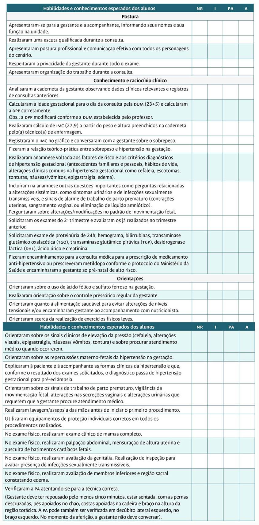 O checklist para a avaliação dos alunos sofreu alguns ajustes após as ponderações dos juízes. Para facilitar a identificação das prioridades a serem desenvolvidas pelos alunos e orientar o educador durante o andamento do cenário, os itens foram agrupados em seções (postura, conhecimento teórico/raciocínio clínico e habilidades técnicas) e, dentro de cada seção, os itens foram colocados em ordem de execução de acordo com o esperado para o cenário. Além disso, pelo fato de serem cenários que exigem muitas condutas dos alunos, elencaram-se as prioritárias à boa evolução do quadro clínico das gestantes atendidas e esses tópicos foram destacados na cor azul.