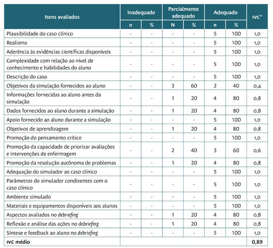 Os dados obtidos foram analisados em planilhas no software Microsoft Excel®, versão 2016. Para a validação do cenário, realizou-se o cálculo do ivC de cada item avaliado dividindo-se o quantitativo de respostas “adequado” pelo total de respostas, que também corresponde ao total de juízes. O ivC médio foi calculado a partir de uma média de todos os ivCs obtidos nos 20 itens 17. O ivC mede a concordância dos juízes sobre os itens analisados e varia de 0 a 1,0. Para a validação do cenário, adotou-se um ivC mínimo de 0,75, de acordo com a recomendação da literatura 18. Os itens que não atingiram o ivC de 0,75 foram adaptados seguindo as recomendações propostas pelos juízes.