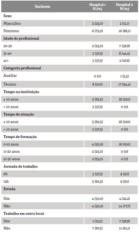 Na Tabela 1 são apresentadas as características da amostra. Em ambos os hospitais verificou-se um perfil majoritariamente de técnicos de enfermagem (HI = 100 %; h2 = 94,4 %), do sexo feminino (HI = 75,0 %; H2 = 88,1 %) e com idade superior aos 30 anos (HI = 75,0 %; h2 = 61,0 %). Os profissionais eram formados a menos de 10 anos (HI = 50 %; h2 = 100 %) e o tempo de atuação coincidiu com o tempo na instituição em ambos os hospitais. A maioria dos profissionais não trabalhava em outro local concomitantemente com os hospitais estudados (HI = 87,5 %; h2 = 61,1 %).