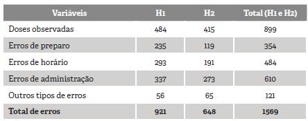En ambos hospitales se verificó un perfil mayoritariamente de técnicos de enfermería (H1=-100%, H2 = 94,4 %), de sexo femenino (H1 = 75,0 %, H2 = 88,1 %) y edad superior a los 30 años (H1 = 75,0 %, H2 = 61,0 %). Se observaron 899 dosis en H1 y H2, que resultaron en 921 y 648 errores respectivamente, de los cuales 464 (53,6 %) en el H1 y 118 (24,4 %) en el H2 estuvieron directamente relacionados con interrupciones en el trabajo. Cada dosis observada sufrió aproximadamente 1,7 errores y se verificó cerca de 26 (H1) y 16,2 (H2) errores por hora.