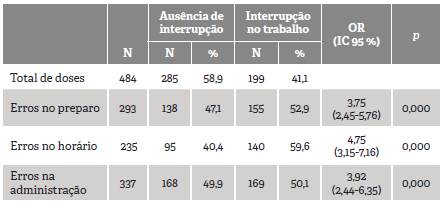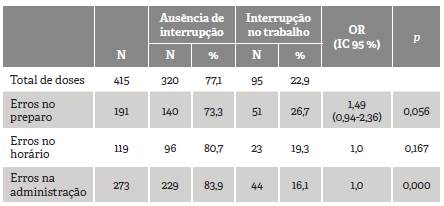 No Hospital 1, 41,1 % das doses sofreu interrupção durante o processo de medicação, onde as taxas de erro foram maiores. A presença da interrupção aumentou significativamente o risco para a ocorrência de erros no preparo (OR = 3,75; p = 0,000), no horário (OR = 4,75; p = 0,000) e na administração (OR = 3,92; p = 0,000) (Tabela 3).