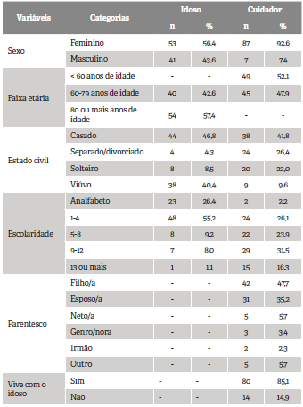 A população do estudo foi determinada pelo tempo de coleta das informações, entre os meses de maio de 2017 a janeiro de 2018, totalizando 94 idosos com seus respectivos cuidadores. As entrevistas (com duração de 40 minutos) foram realizadas no domicílio do idoso com prévio agendamento por alunos de graduação e pós-graduação treinados.