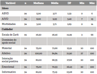 A análise descritiva das variáveis dos instrumentos utilizados para a avaliação do idoso (ABVD, AIVD e morbidades) e do cuidador (escala de Zarit e instrumento de medida de rede e apoio social) pode ser visualizada na Tabela 2.