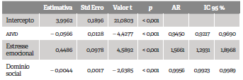 Na análise de regressão, verificou-se que para cada ponto a mais nas AIVD, há uma redução de 5,5 % na sobrecarga. Por sua vez, o cuidador com estresse emocional possui uma média de 56,61 % a mais de sobrecarga do que cuidadores sem estresse emocional. E para cada ponto a mais no domínio interação social positiva do instrumento de medida de rede e apoio social, há uma redução de 0,44 % na sobrecarga (Tabela 3).
