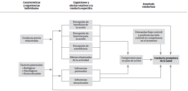 Este sustento teórico de enfermería implementado en población adolescente puede contribuir a la promoción de la salud de los trabajadores, puesto que se soporta en la teoría de aprendizaje de Albert Bandura y la teoría de acción razonada de Martin Fishbein, quienes explican los cambios de conducta de los seres humanos 11. El modelo establece tres grandes componentes (Figura 1): (i) las características y experiencias individuales, (ii) las cogniciones y afectos relativos a la conducta específica y (iii) un resultado conductual 12, los cuales pueden enfocarse a los trabajadores.