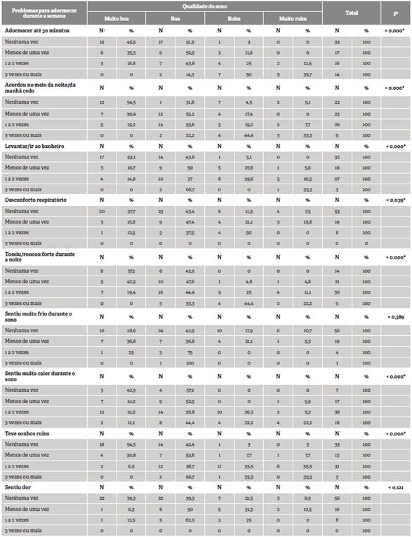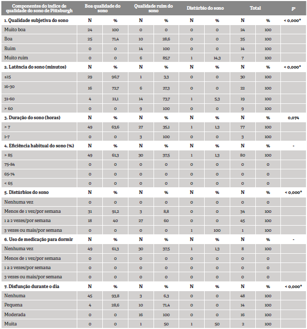 Constatou-se predominância total de seis componentes referentes à boa qualidade do sono, no qual o único que não obteve resultado com significância estatística foi o componente problema/distúrbio do sono (p = 0,074).