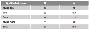 Constatou-se que 35 (43,7 %) pais e/ou responsáveis consideraram que as crianças possuíam boa qualidade do sono no último mês.