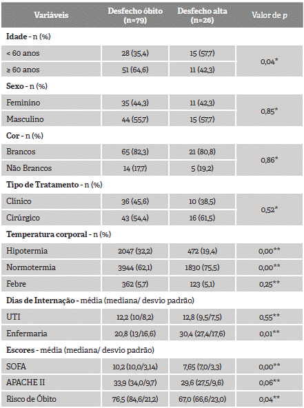 retrospective, descriptive and exploratory study. Patients over the age of 18 were included, diagnosed with severe sepsis or septic shock in the period from January to December 2012, assisted in an UCI of a public hospital. Sociodemographic, clinical and outcome variables were built. For the evaluation of the TC, all measures recorded during hospitalization were considered, taken in the axillary region by digital thermometer coupled to the multiparametric monitor. In addition, comparative scenarios were proposed between the number of episodes of fever or hypothermia in the 24 hours after internment and the number of these 24 hours prior to the outcome. The data were collected from physical and electronic medical records.