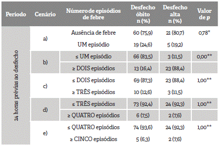 Com respeito às TC verificadas nas 24 horas prévias ao desfecho, no cenário (b) evidenciaram-se diferenças estatisticamente significantes entre grupos. A ocorrência de pelo menos dois episódios de febre foi mais frequente no grupo que recebeu alta (88,4 %).