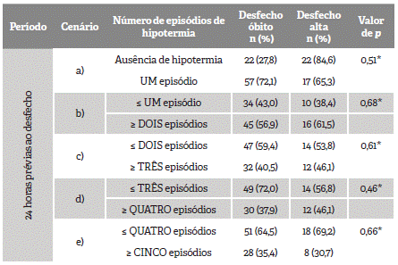 Dado que não houve padronização do número de medidas entre os pacientes, a fim de avaliar se o número de ocorrências de febre e/ou hipotermia poderia ser um indicador de mortalidade nos pacientes com sepse, optou-se por considerar dois períodos (analisados separadamente): medidas da TC realizadas nas primeiras 24 horas de internação e as medidas registradas nas 24 horas que antecederam o desfecho. Nesses períodos, consideraram-se cinco cenários comparativos para a febre: (a) sem febre, comparados com aqueles que apresentaram até um episódio; (b) até um episódio, comparados com aqueles que apresentaram mais que dois episódios; (C) até dois episódios, comparados com aqueles que apresentaram mais que três episódios; (d) até três episódios, comparados com aqueles que apresentaram mais que quatro episódios; (e) até quatro episódios, comparados com aqueles que apresentaram mais que cinco episódios. Da mesma maneira, esses cenários foram considerados para a análise da variável hipotermia.