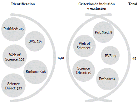 Se identificaron 1461 artículos posibles, con los términos y estrategias de búsqueda: Tuberculosis and health workers; infection control measures and tuberculosis; sin embargo, al aplicar los criterios de exclusión, 45 artículos cumplieron con los criterios de inclusión para este estudio.