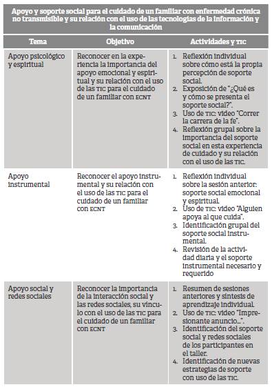 Ante la necesidad de soporte social a los cuidadores, el programa "Cuidando a los Cuidadores®" de la Facultad de Enfermería de la Universidad Nacional de Colombia 19 implementó la intervención de enfermería denominada "Alguien apoya al que cuida", haciendo uso de las tic para ofrecer soporte social. El objetivo de este estudio fue determinar el efecto de esta intervención de enfermería sobre las percepciones de soporte social y de sobrecarga que tienen los cuidadores familiares de personas con enfermedad crónica.