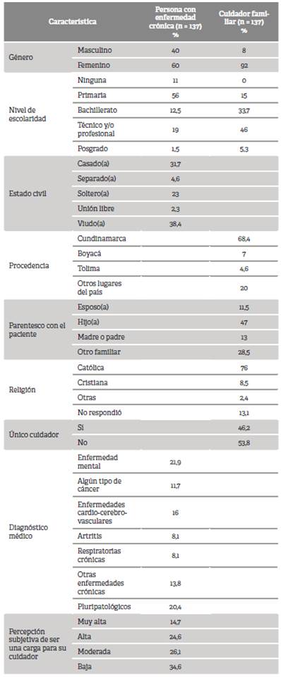 Las características sociodemográficas de los cuidadores y las personas con ECNT se encuentran en la Tabla 1.