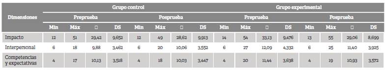 En cuanto a la posprueba, ninguna de las variables medidas tuvo diferencias estadísticamente significativas entre el grupo control y el grupo experimental, por lo que la intervención propuesta no tuvo resultados de efectividad estadísticamente comprobada.
