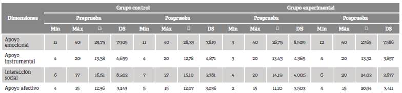 En cuanto a la variable soporte social, tampoco se identificaron diferencias numéricamente importantes entre las medias pre y pos de la intervención convencional. Respecto al grupo experimental el aumento mínimo que se tuvo fue en la dimensión de apoyo emocional y en el total de la escala (véase Tabla 4).