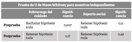 Frente a los resultados intergrupo (Tabla 5) se encontró que en la preprueba de ambos grupos solo la variable de sobrecarga del cuidado tuvo diferencias significativas, indicando que cada grupo partió en niveles diferentes; en comparación con la variable de soporte social que no tuvo diferencias significativas antes de la intervención.