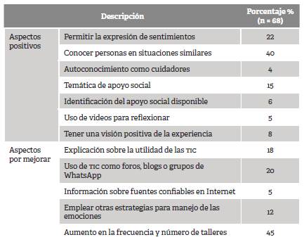 Además de estos resultados, los participantes pertenecientes al grupo experimental evaluaron la intervención de "Alguien apoya al que cuida", en la que se observa que lo más importante para ellos fue haber conocido otras personas en situaciones similares y dentro de los aspectos por mejorar está el aumento en frecuencia y número de talleres. Se debe resaltar que los cuidadores identifican la tic como algo positivo, pero desean que se amplíe esta estrategia con otros recursos basados en aplicaciones tecnológicas e Internet (véase Tabla 6).