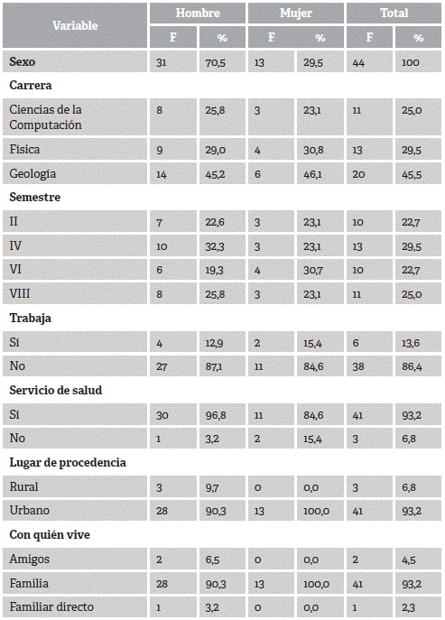 Los estudiantes tenían una edad promedio de 20 años (DE = 1,4), el 70,5 % eran hombres y solteros la mayoría. Un 45,5 % estudiaba geología, 29,5 % física y 25 % ciencias de la computación. La distribución por semestre académico fue proporcional, ligeramente mayor en cuarto semestre (29,5 %). Un 86,4 % de los estudiantes no trabajaba. La mayoría contaba con servicio de salud (93,2 %), provenía del área urbana (93,2 %) y vivía con su familia (93,2 %) (Tabla 1).