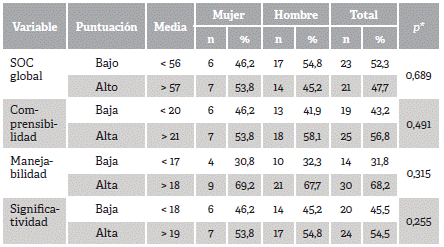 Los estudiantes universitarios en un 52,3 % obtuvieron en general SOC global bajo con puntuación inferior a la media (57,0 puntos), con mayor predominio en hombres (54,8 %). Se observó comprensibilidad alta (56,8 %) al mostrar un promedio igual o mayor a 21,0 puntos, con prevalencia en hombres (58,1 %). En manejabilidad el nivel fue alto (68,2 %) con media igual o mayor a 18,0 puntos, siendo mayor en mujeres (69,2 %). En significatividad el nivel fue alto (54,5 %) con puntaje medio igual o mayor a 19,0 puntos, con mayor frecuencia en hombres (54,8 %). Según el sexo de los estudiantes, el SOC global y sus dimensiones no mostraron diferencia estadísticamente significativa, con valor p > 0,05 (Tabla 2).