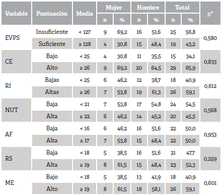 Los estudiantes universitarios en un 56,8 % obtuvieron en general un EVPS global insuficiente con puntuación inferior a la media (128 puntos) con mayor frecuencia en mujeres (69,2 %). Mostraron CE alto (65,9 %; media ≥ 26), AF alta (50 %; media ≥ 17), RS alta (52,3 %; media ≥ 19) y ME alto (59,1 %; media ≥ 19) con mayor predominio en mujeres; sin embargo, las RI fueron altas (59,1 %; media ≥ 26) y en NUT hubo baja percepción (54,5 %; media ≥ 26), ambas fueron mayores en los hombres. Según el sexo de los estudiantes, no hubo diferencia estadísticamente significativa en EVPS global y cada una de las dimensiones, con valor p > 0,05 (Tabla 3).