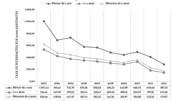Despite fluctuations in the analyzed period, hospitalization rates decreased by 71.88 %. In children under one year the decrease was 71.49 % and the age between one and four years the reduction was 72.30 %. Most hospi-talizations occurred in males, and the causes that prevailed were infectious gastroenteritis and bacterial pneumonia.