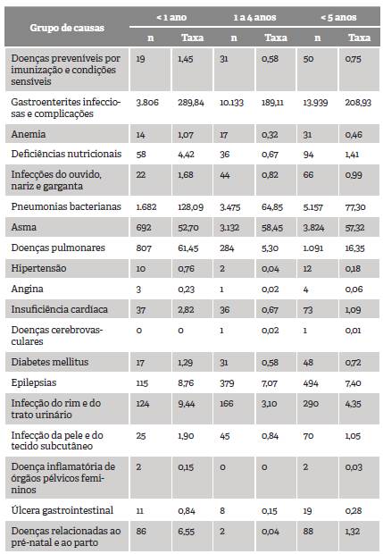 A Tabela 1 apresenta a distribuição por faixa etária e os grupos de causas de hospitalizações por CSAP, com um total de 19 categorias, elaboradas de acordo com a lista da Classificação Internacional de Doenças (CID-10). Dentre essas categorias, as gastroenterites infecciosas e suas complicações compõem a maior parte das hospitalizações. No total, ocorreram 13.939 casos em crianças menores de cinco anos por gastroenterites infecciosas e suas complicações, o que corresponde a uma taxa de 208,93/10.000. Observa-se que crianças menores de um ano apresentaram taxa maior (289,84/10.000) do que crianças com idade entre um e quatro anos para esse grupo de causas.