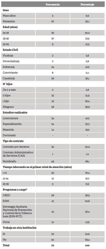 Del estudio se identificó que predominaba el sexo femenino en un 93,1 % y la edad promedio fue de 39,76 (rango 25-65 años). El porcentaje de participantes sin pareja representaba el 52,8 % y tenían entre uno y más hijos el 61,1 %. Con respecto al programa que tienen a cargo, el 38,9 % de participantes refirió que era el programa de crecimiento y desarrollo (CRED), sin embargo, los participantes afirmaron realizar distintas actividades simultáneamente (Tabla 1).