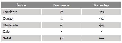 El índice de capacidad de trabajo fue excelente para 37,5 %, bueno para 43,1 %, moderado para 194 % y ningún participante estimó un índice bajo, además, estadísticamente se evidenció que el número de hijos presenta una asociación significativa con el índice (chi-cuadrado = 14798, p = 0,022).
