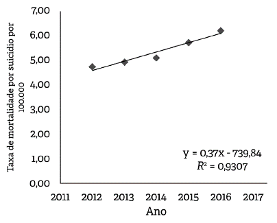 A análise de tendência (Figura 1) indicou crescimento da taxa de mortalidade por suicídio por 100 mil, ao longo do período de 2012 a 2016 (R2 = 0,9307, p < 0,001).