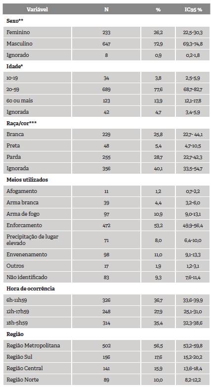 Ainda, os casos de suicídio foram caracterizados segundo as variáveis: sexo, idade, raça/cor, meios utilizados, hora de ocorrência e região, sendo os resultados apresentados em frequência bruta, relativa e intervalo de confiança de 95 %.