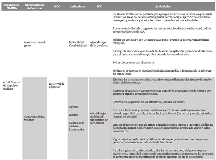 A partir del juicio clínico se estableció como diagnóstico enfermero: 00222 control de impulsos ineficaz. Características definitorias: arrebatos de mal genio, comportamiento violento. Factor relacionado: trastorno del estado de ánimo.