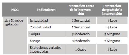 La Tabla 2 presenta las puntuaciones antes y después de la intervención según el NOC y los indicadores establecidos. Refleja el efecto de las actividades de enfermería de salud mental sobre la respuesta desadaptativa de RAA. En cuanto la intervención llegó a su fin, mostró una respuesta más adaptativa en todos los indicadores.