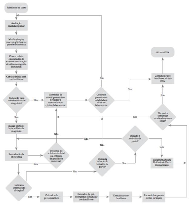 Após a escolha do tema, foi desenhado o mapa de fluxo de pacientes admitidas na UTIM com DHG (Figura 1).