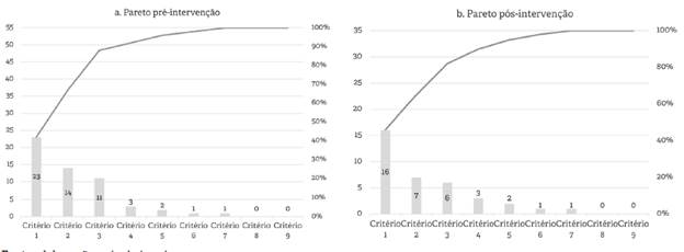 Em relação às oportunidades de melhorias, na fase pré-intervenção, foi observada uma não conformidade total de 12 % (55/450 oportunidades), sendo a distribuição absoluta e relativa apresentada no gráfico de Pareto (Figura 2). Esse gráfico mostrou que os critérios que deveriam ser priorizados eram a "manutenção do sulfato de magnésio -Critério 1", a "realização de ultrassom obstétrico - Critério 2" e a "necessidade de restrição hídrica durante a internação - Critério 3", que, somados, corresponderam a mais de 85 % do total de não cumprimentos.