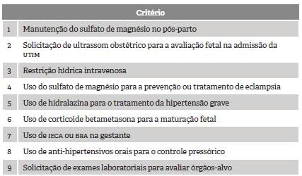 Os critérios de qualidade foram construídos baseados nas recomendações presentes nas revisões sistemáticas realizadas pelo American College of Obstetricians and Gynecologists 8 e pela International Society for the Study of Hypertension in Pregnancy 9, sendo utilizado como critério de escolha um grau de recomendação considerado "forte" e sua aplicabilidade na unidade. Os critérios de qualidade definidos foram submetidos a uma avaliação de face, de conteúdo e de validade de critério. Ao final, foram eleitos nove critérios, todos relativos ao processo assistencial, para a avaliação nas etapas pré e pós-intervenção (Quadro 1).