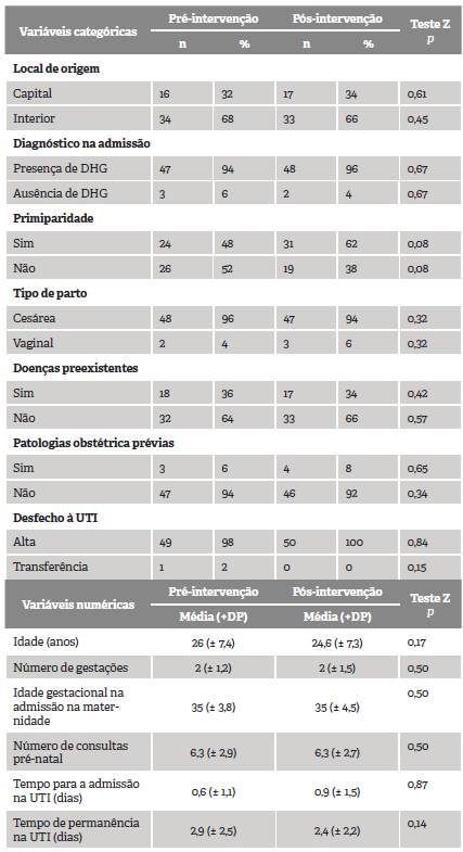 Quanto às características da amostra, os grupos pré e pós-intervenção apresentaram semelhanças nos aspectos relativos à procedência das mulheres, ao diagnóstico de DHG na admissão e à prevalência de patologias sistêmicas e obstétricas prévias. O principal tipo de parto observado em ambos os grupos foi a cesárea, e a quase totalidade das pacientes recebeu alta da UTIM, sendo que uma paciente do grupo pré-intervenção foi transferida para outro serviço. Os dados também mostraram que não houve diferenças em relação à idade, ao número de gestações, à idade gestacional na admissão na maternidade, ao tempo para admissão e ao tempo de permanência na UTIM (Tabela 1).