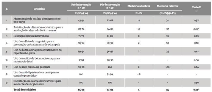 O nível de qualidade inicial foi alto em seis dos nove critérios (amplitude: 94-100 %), as práticas com menor adesão foram a "manutenção de sulfato de magnésio" (54 %), "solicitação de ultrassom fetal" (72 %) e "restrição hídrica intravenosa" (78 %). Houve melhoria absoluta em cinco dos nove critérios (amplitude: 2-16 %), que foi significativa para a solicitação de ultrassom fetal (melhoria absoluta: 16 %; p = 0,023) e para o total de critérios (4 %; p = 0,01).