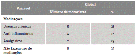 Desvelaram-se duas categorias: As relações interpessoais no trânsito impactam diretamente o estado físico e psicológico e A relação com o tempo influencia o comportamento dos condutores. Todos os entrevistados relataram o uso de remédios de ação anti-inflamatória e analgésicos uma vez por semana. A maioria dos motoristas trata doenças crônicas com medicamentos. Nenhum participante realiza acompanhamento psicológico; há o interesse e o desejo, porém é relatado que a rotina de trabalho inviabiliza a terapia. A média de idade é de 41,6 anos; participaram do estudo 22 homens e duas mulheres (Tabela 1).