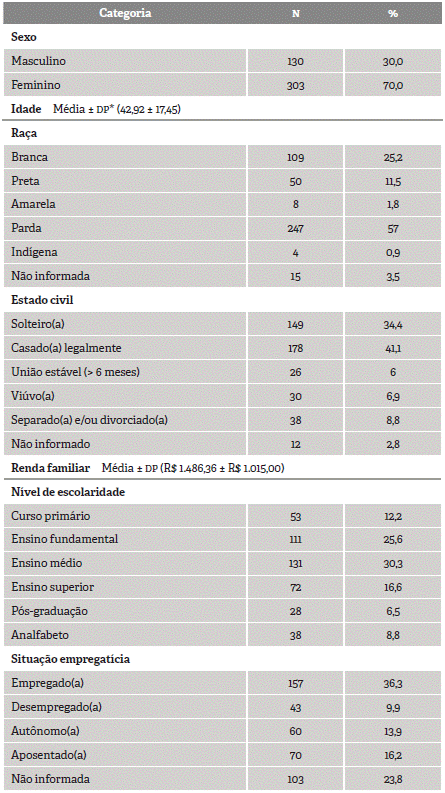Entre os participantes, 303 (70 %) eram do sexo feminino. A média para a idade ficou entre 42,92 anos (DP ± 17,4). Quanto à raça, 247 usuários (57,0 %) declararam cor parda. De acordo com o estado civil, 178 indivíduos (41,1 %) estavam em situação de casado(a) legalmente. A média da renda familiar ficou concentrada em R$ 1.486,36 (DP ± 1.015,0). Observou-se que 131 indivíduos (30,3 %) apontaram ensino médio como nível de escolaridade. Quanto à situação empregatícia, 157 usuários (36,3 %) estão empregados de acordo com a descrição observada na Tabela 1.