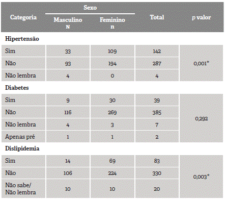 Ressalta-se que, dos 433 entrevistados, 142 indivíduos referiram ter hipertensão; destes, 109 eram mulheres. Assim, o sexo feminino esteve associado à maior prevalência de hipertensão (p = 0,001). A presença de dislipidemia também obteve associação significativa com o sexo feminino (n = 8; p = 0,003). Quanto ao diagnóstico de diabetes, não houve associação significativa com o sexo, como demonstra a Tabela 2.