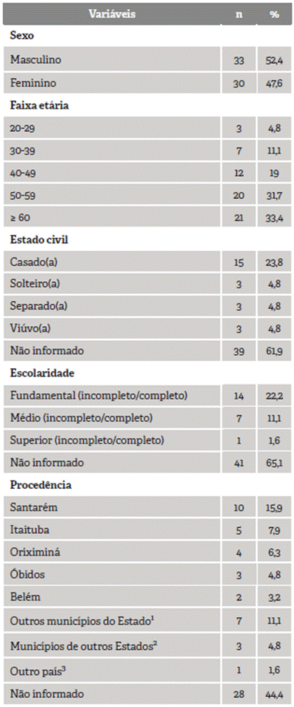 A Tabela 1 apresenta a caracterização sociodemográfica dos 63 prontuários de pacientes que fizeram parte da amostra do estudo. Nota-se predominância do sexo masculino (52,4 %), faixa etária com 60 ou mais anos (33,4 %), estado civil casado (23,8 %), escolaridade com ensino fundamental (incompleto/ completo; 22,2 %) e com procedência de Santarém (15,9 %). Contudo, chama-se a atenção para a frequência de dados não informados nos prontuários referentes ao estado civil (61,9 %), à escolaridade (65,1 %) e à procedência (44,4 %). Por fim, ressalta-se que a idade mínima encontrada foi de 21 anos, a máxima de 89 anos, e a idade média foi de 53,4 ± 14,1 anos.