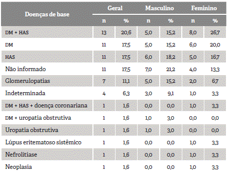 Entre as doenças de base encontradas no estudo, o diabetes mellitus associado à hipertensão arterial sistêmica (20,6 %) aparecem como a principal causa indutora da insuficiência renal crônica, seguidas do diabetes (17,5 %) e da hipertensão (17,5 %) de formas isoladas, o que mostra a elevada relação dessas doenças com o surgimento da DRC 1,13. Quanto ao sexo mais acometido pelas doenças, notou-se pouca diferença na distribuição, como visto em outro estudo, cujo sexo não mostrou relação de influência para a ocorrência dessas doenças 14. Além disso, as glomerulopatias encontradas no estudo estão associadas ao surgimento da insuficiência renal 7,15.