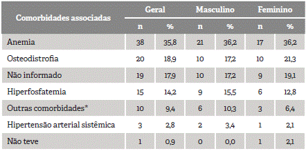 Quando observada a distribuição das comorbidades, nota-se que a anemia foi a mais presente de forma geral e na distribuição por sexo (Tabela 3).