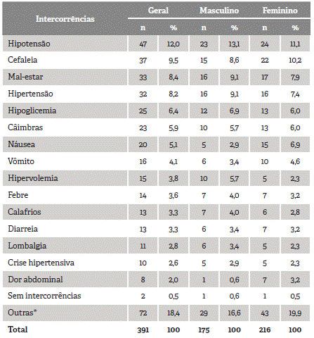 O sexo masculino predominou (52,4 %) com faixa etária de 60 ou mais anos (33,4 %) e a idade média foi de 53,4 ± 14,1 anos. Quanto às intercorrências, foram notificados 45 tipos, dos quais a hipotensão (12 %), a cefaleia (9,5 %), o mal-estar (8,4 %), a hipertensão (8,2 %), a hipoglicemia (6,4 %) e câimbras (5,9 %) foram as mais frequentes. As doenças de base mais evidenciadas foram o diabetes mellitus e a hipertensão arterial, enquanto a anemia predominou nas comorbidades.